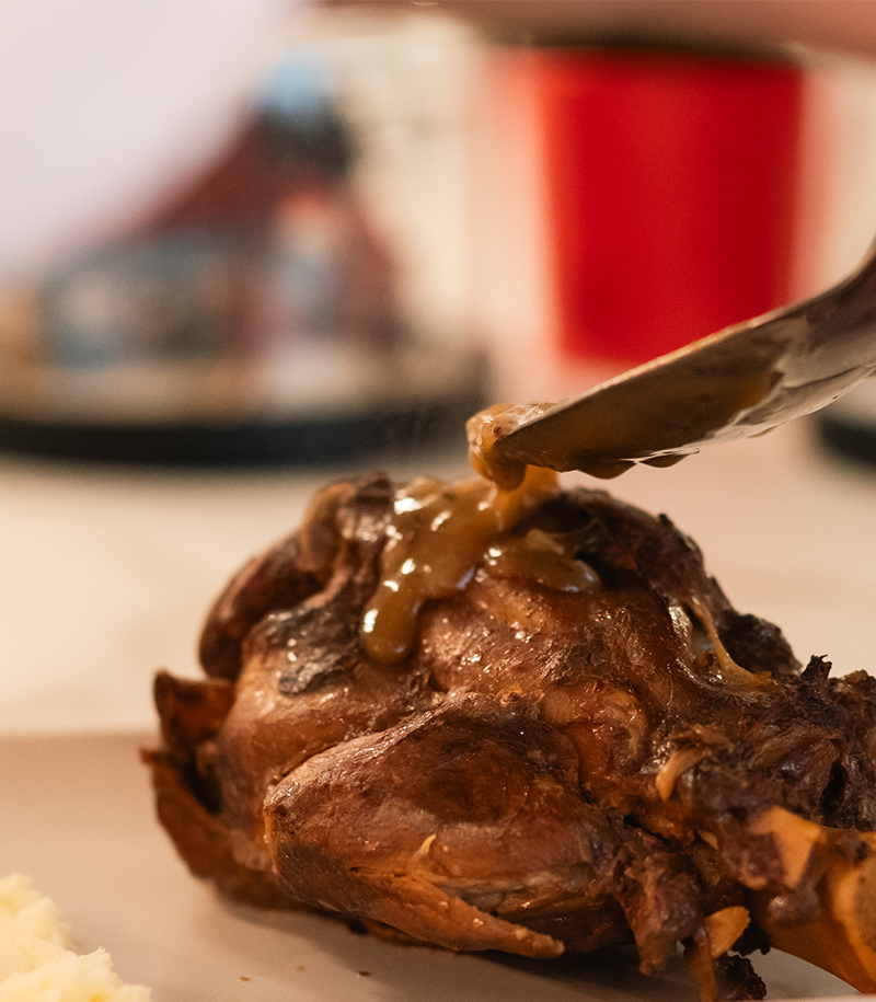 - Put the knuckle on a plate and accompany it with the smashed potatoes.