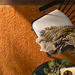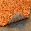Alfombra peluda de color naranja brillante con textura de pelo grueso y suave, colocada sobre piso de madera, mostrando una sensación de calidad premium.