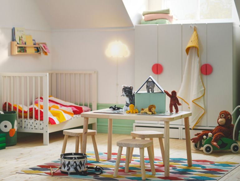 Keeping clothes and toys organized in the children's room can be a challenge. The BARNDRÖM collection makes it both easier and more enjoyable. There are boxes in different sizes where playful cats, clearly marked numbers and houses make cleaning fun. And when the hangers are shaped like cars or have little hearts, it suddenly becomes fun to hang clothes in the wardrobe too. Everything matches the textiles in the collection – and are nice complements to the furniture in the SMÅSTAD series.