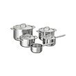 Includes: 1 pot with lid (10.6 qt), 1 pot with lid (5.3 qt), 1 pot with lid (3.2 qt), 1 saucepan with lid (2.1 qt) and 1 saucepan (1.1 qt).