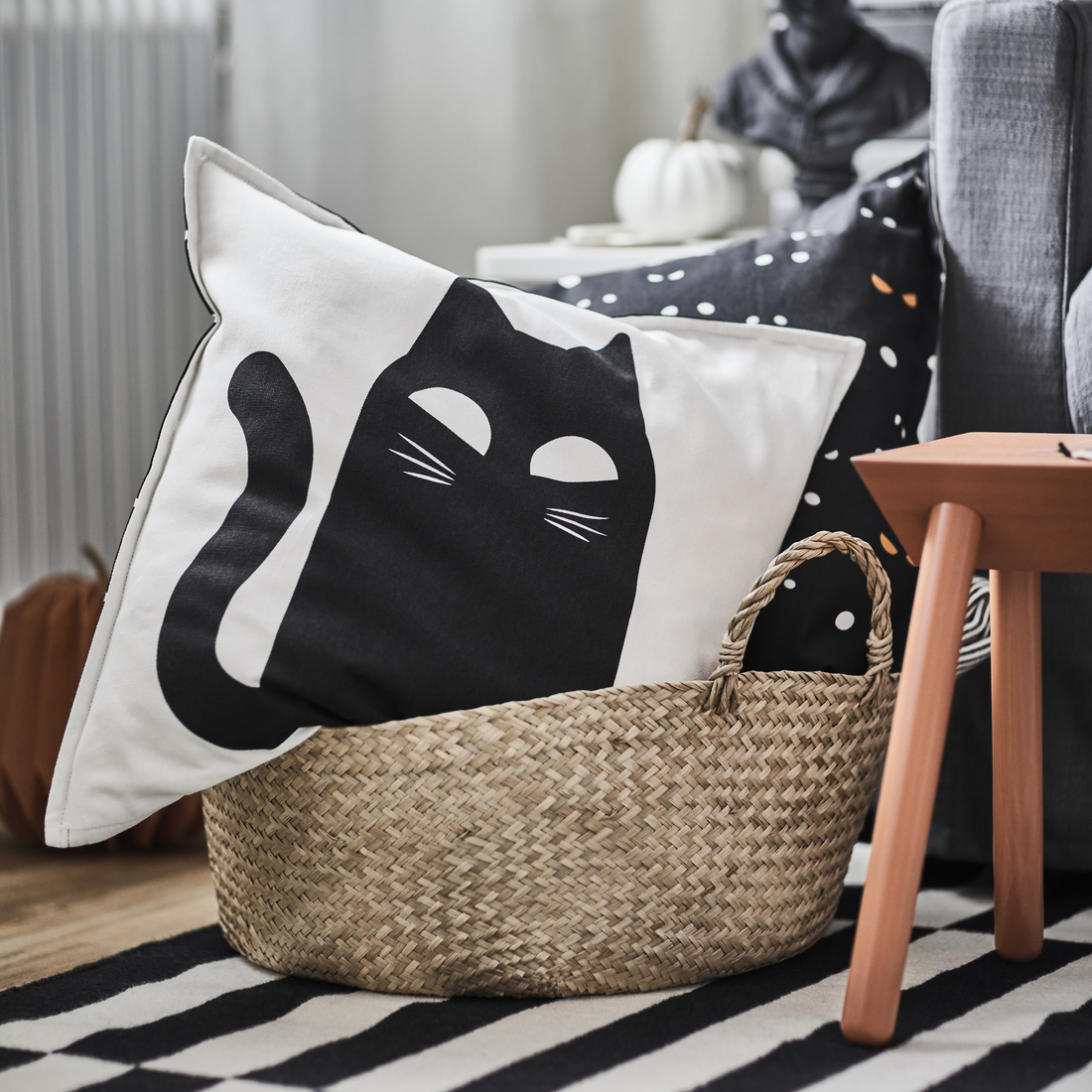 Get your home ready for Halloween! This eerie cushion cover in pure cotton has 2 different designs − a black cat and spooky cat eyes. Choose a side based on your mood and machine wash it when needed.