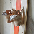 La cesta de yute MÄVINN cuelga con cucharas de madera sobre tablas rojas y blancas.