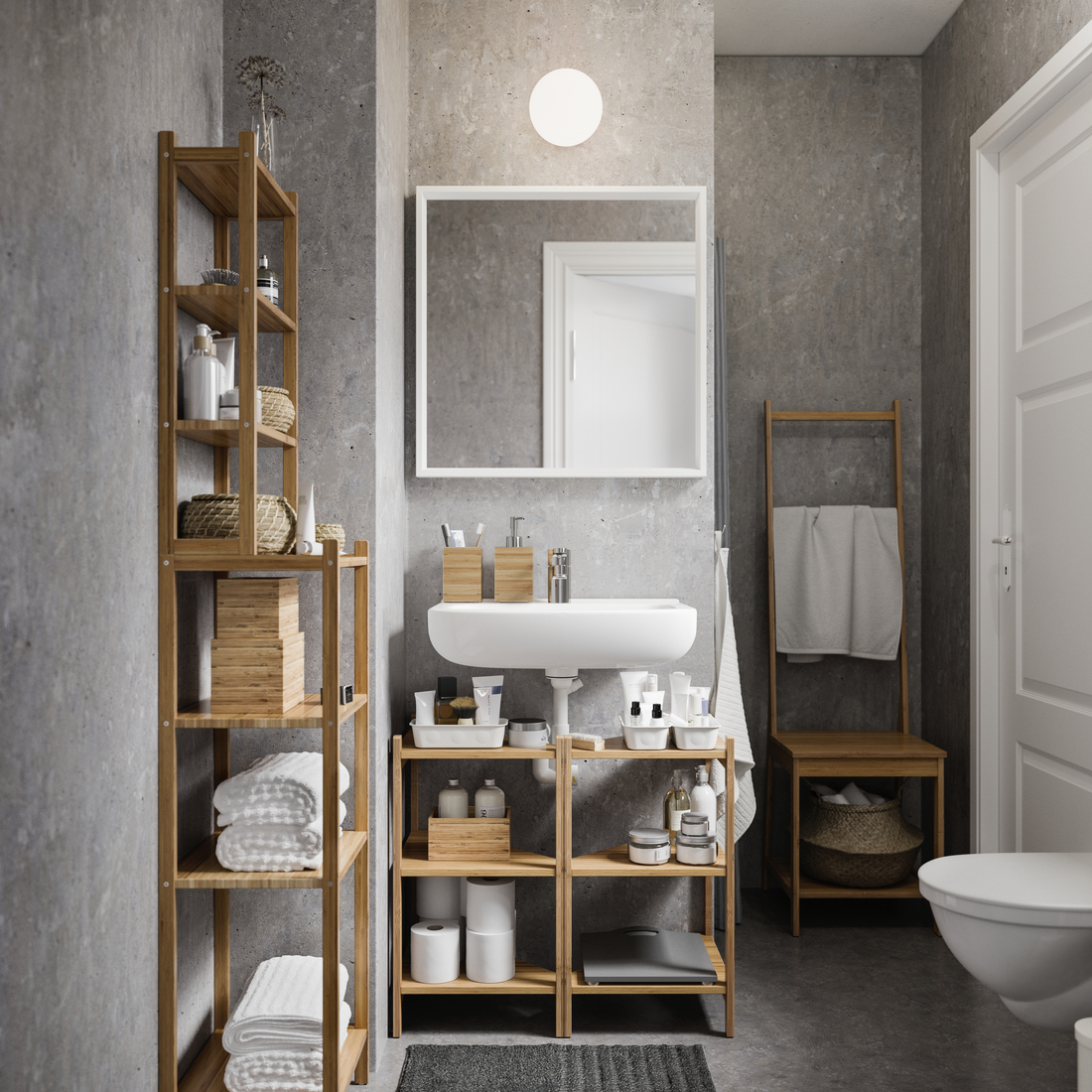 The shelves with different depths accommodate both towels and baskets as well as smaller toiletries. Made from bamboo, RÅGRUND bathroom series is perfectly suited to humid areas like the bathroom.