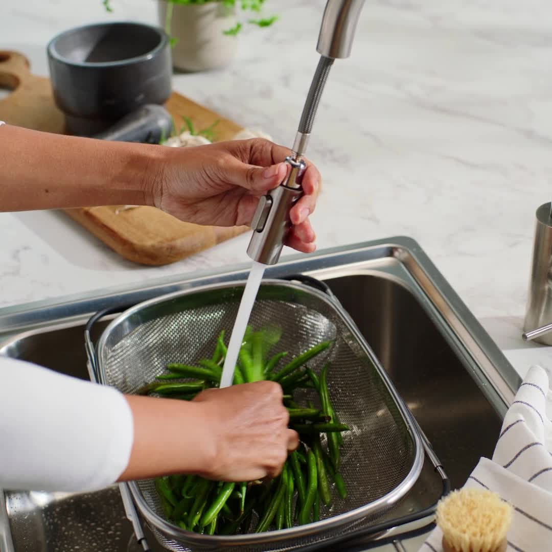 Dual-spray functionality allows you to switch between regular flow and spray for tasks like filling pots and a spray mode for rinsing dishes.