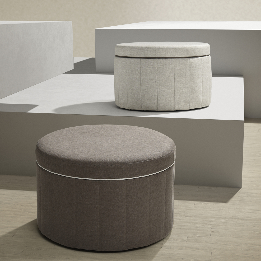 Large, round pouffe in a classic style that owns its place. A generous storage space with roomy pockets is also hidden behind the elegant pleating on the sides and the decorative piping around the lid.
