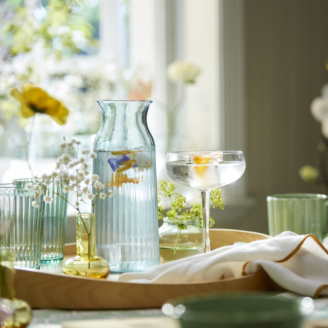 This light-turquoise glass carafe with a narrow, easy-to-grip neck makes a lovely addition to most table settings – and it can be used in many ways. Why not as a vase filled with all the flowers of spring?