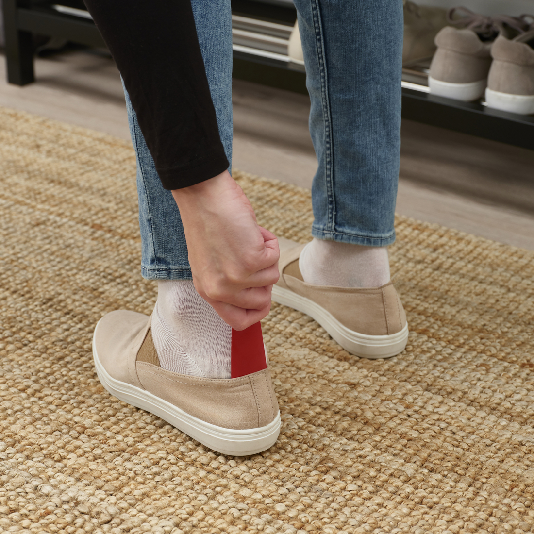 Short shoehorn made of metal in lovely bright red. Feel free to hang it on a hook in the hallway so that you always have it close at hand when putting on your shoes before heading out the door.