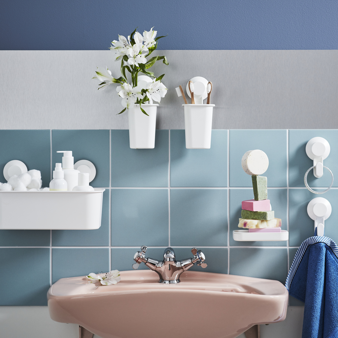 Do you want to avoid drilling holes in your wall? Then choose bathroom accessories from the series TISKEN or IMMELN. They can be fastened to tiles, mirrors, glass and high gloss finishes without having to drill. Practical, fast and easy.