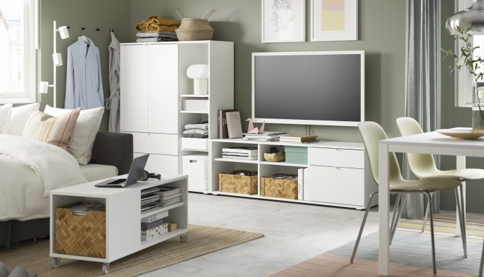 VIHALS storage series has a cohesive look that connects the rooms throughout your home. This TV bench with 2 drawers has storage for your different needs and cable management in the back.