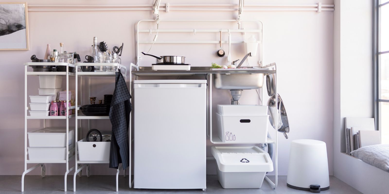 Si te falta espacio en la cocina, tranquilo. Puedes completar el almacenaje con los accesorios especialmente diseñados para tu pequeña cocina SUNNERSTA. Recipientes, ganchos, baldas o escurreplatos pensados para colgarse en la pared, ayudándote a tener la encimera despejada y todo lo que necesitas siempre a mano.