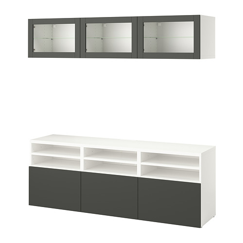 BESTÅ combinación almacenaje TV con guía para gaveta, cierre suave, LAPPVIKEN gris oscuro / SINDVIK vidrio transparente / blanco, 70 7 / 8 "x16 1 / 2 "x75 5 / 8 "