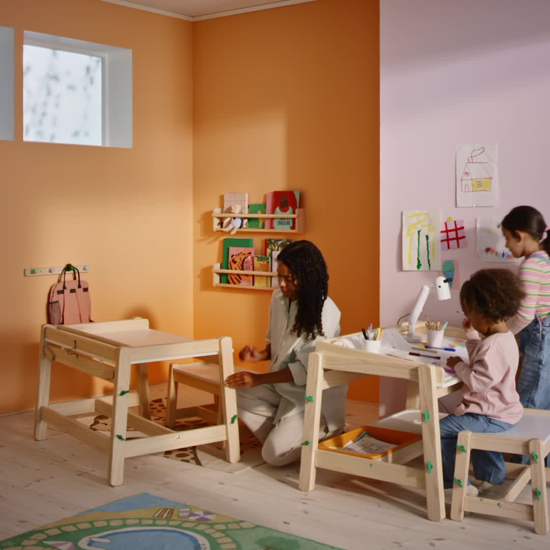 Tres alturas diferentes, un tablero que se puede inclinar y un soporte para el rollo de papel MÅLA. El escritorio es ideal para hacer manualidades y los deberes. Puede crecer a la medida de la tarea y al ritmo de tu hijo.