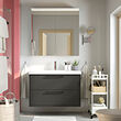 Su diseño sencillo combinado con un acabado en gris oscuro mate aporta personalidad y calma al baño. Además, se puede personalizar fácilmente con las manijas o los tiradores que quieras.
