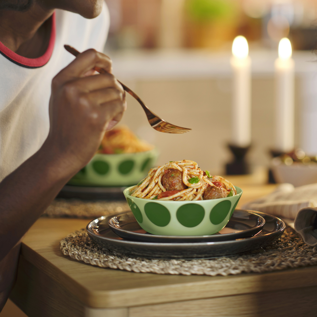 Puedes combinar la vajilla OFTAST verde con piezas de vajilla blancas de la misma serie para darle un toque personal y moderno a la mesa.