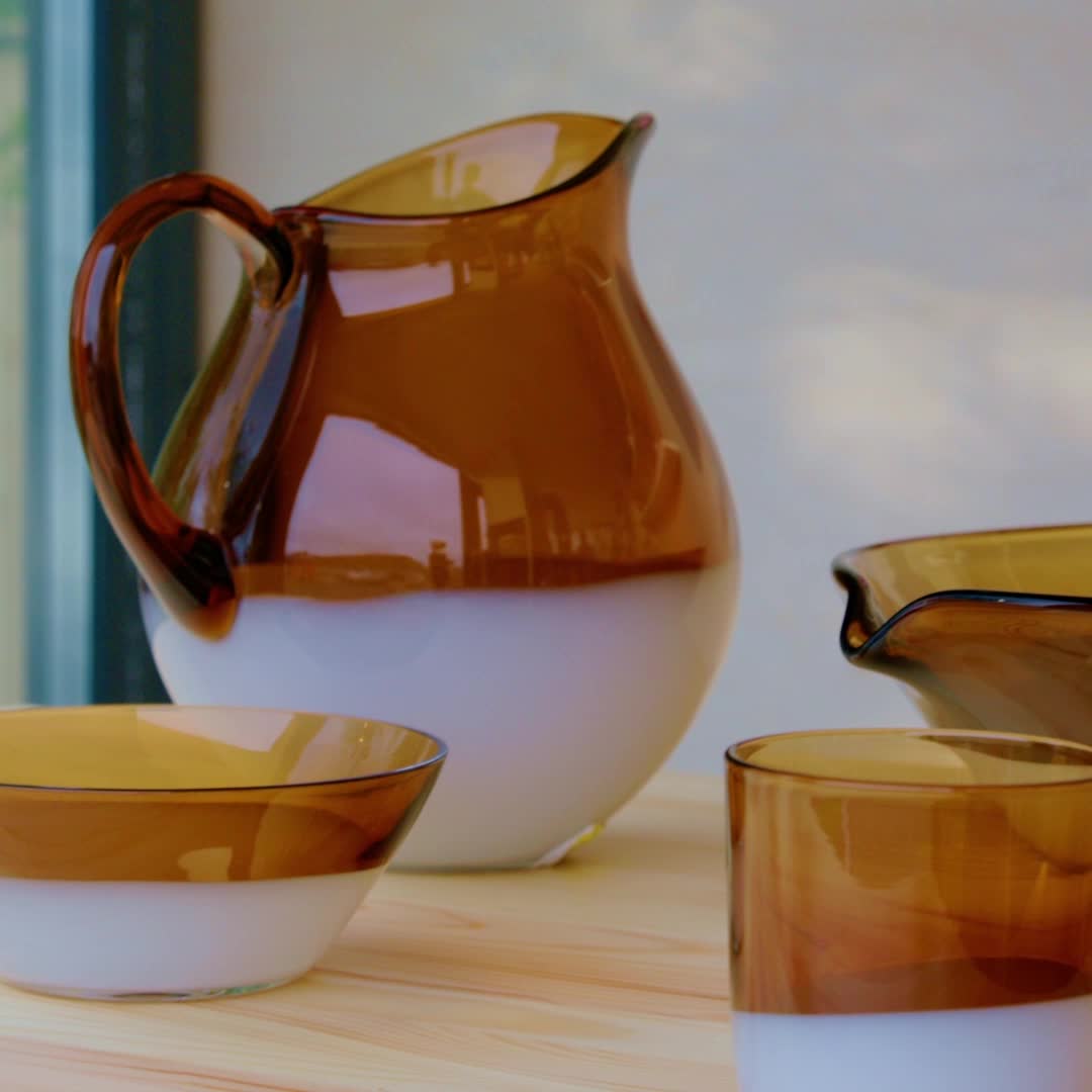 Cada jarra es una pieza única, ya que está hecha de vidrio soplado por un experto soplador. Forma parte de la colección OMMJÄNGE, con productos de diseño moderno inspirados en la herencia cultural y el arte popular suecos.