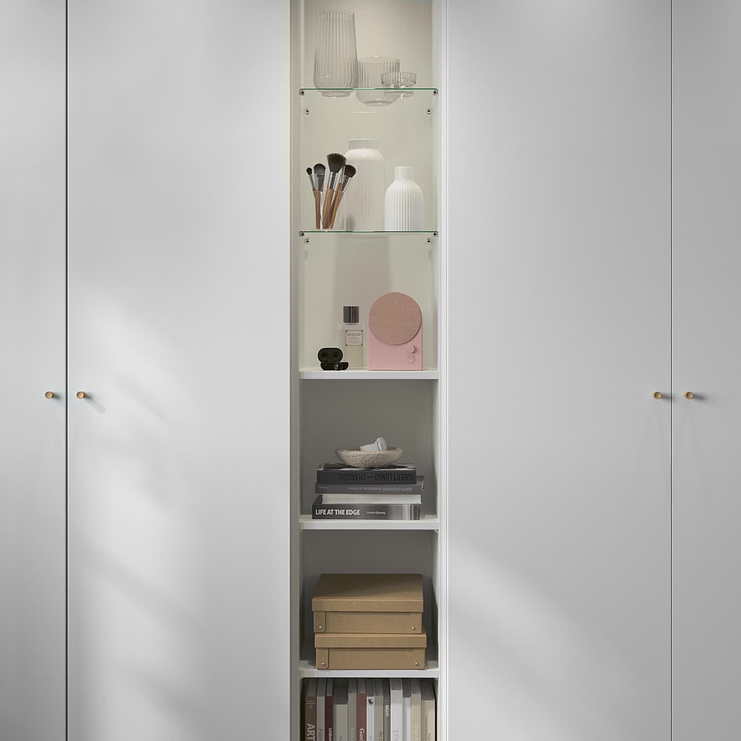 Añade esta unidad final a tu armario PAX para guardar tu ropa y accesorios favoritos a la vista. Los estantes ajustables de vidrio y madera te permitirán personalizar tu espacio.