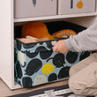 Guarda ropa, juguetes y otras cosas en esta espaciosa caja con un divertido motivo de gatos. Cabe perfectamente en los estantes de las estructuras y los armarios LASTARE para darle un toque más divertido y personal al almacenamiento.