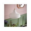 Una lámpara colgante en cerámica blanca con detalles de color latón y un cordón cubierto de tela en un estilo elegante y tradicional. Enciéndela para ver la bonita estructura de la pantalla y cómo destaca el diseño.