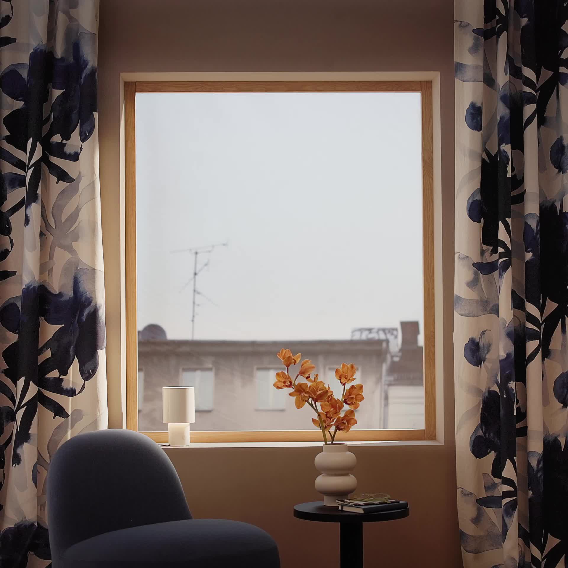 Los pétalos de flores en tonos azules le dan un ambiente veraniego a tu hogar durante todo el año. Las cortinas SKOGSNÄSSLA, hechas de lyocell y cáñamo, ofrecen una caída suave como la del lino y filtran suavemente la luz. Son aptas para barras y rieles.