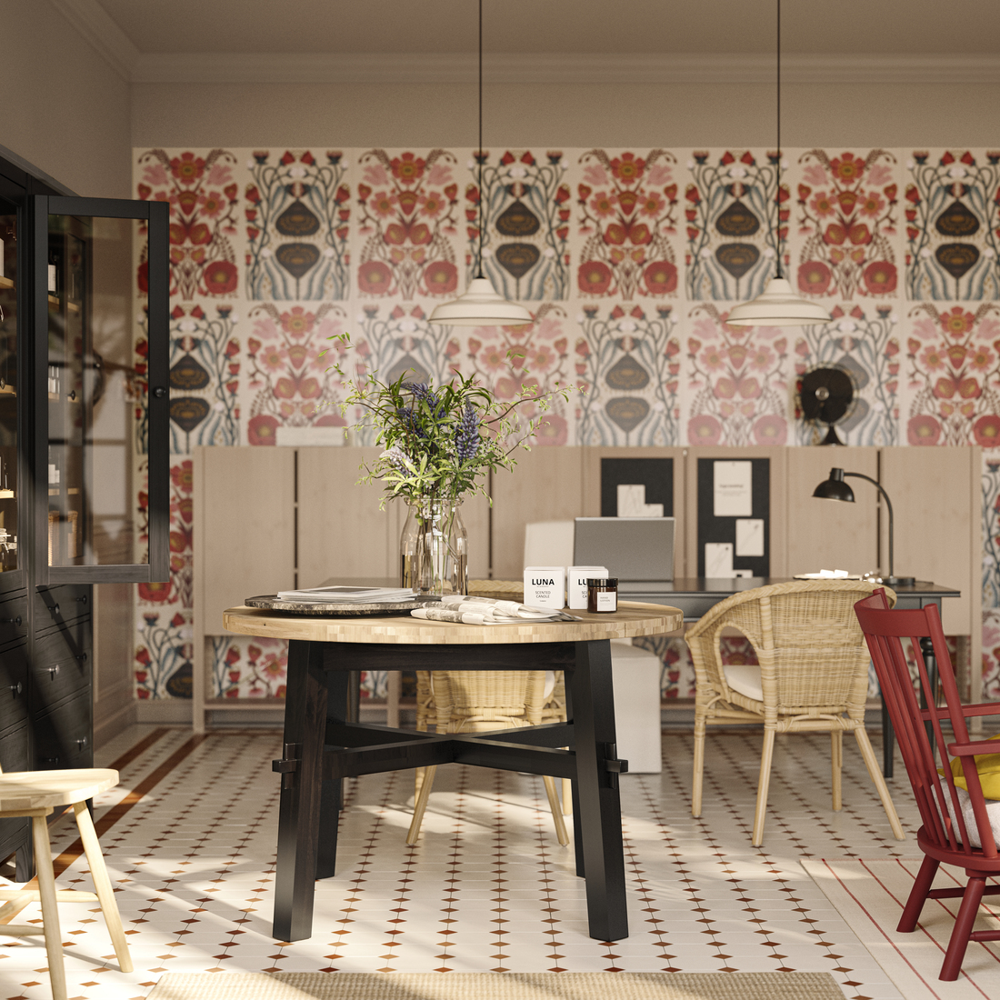 Se ha diseñado para que combine a la perfección con las sillas SKOGSTA. También queda muy bien con las sillas NORDVIKEN y BERGMUND de diferentes estilos.