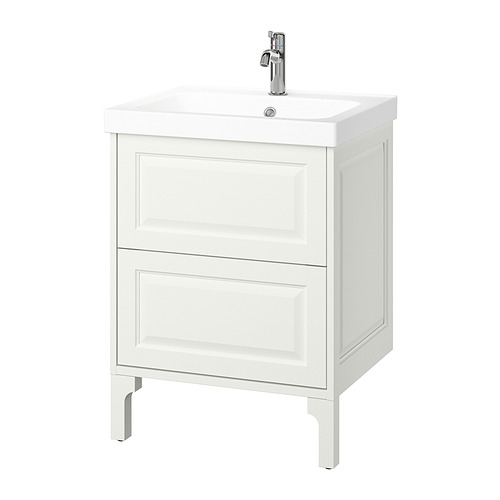 Los muebles de baño TÄNNFORSEN desprenden elegancia con sus bordes biselados que confieren un aspecto artesanal. Esta combinación cuenta con 2 amplios cajones y espacio en el lavamanos para los cepillos de dientes y el jabón.